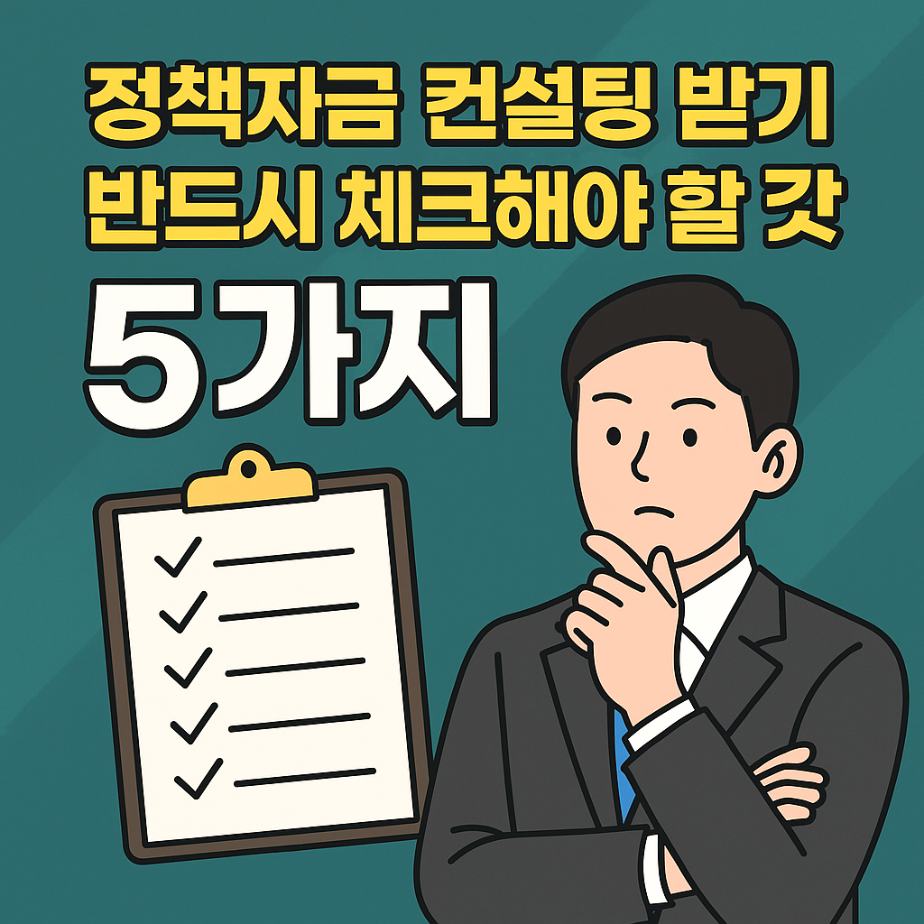 정책자금 컨설팅은 내 사업에 필요한 정부 지원을 원활하게 받기 위한 중요한 서비스입니다. 하지만 업체 선택과 계약 전에는 반드시 위 5가지를 꼼꼼히 체크하여 불필요한 시간과 비용 낭비를 막아야 합니다.